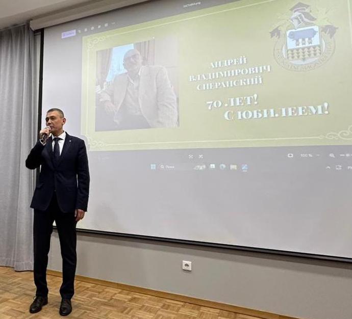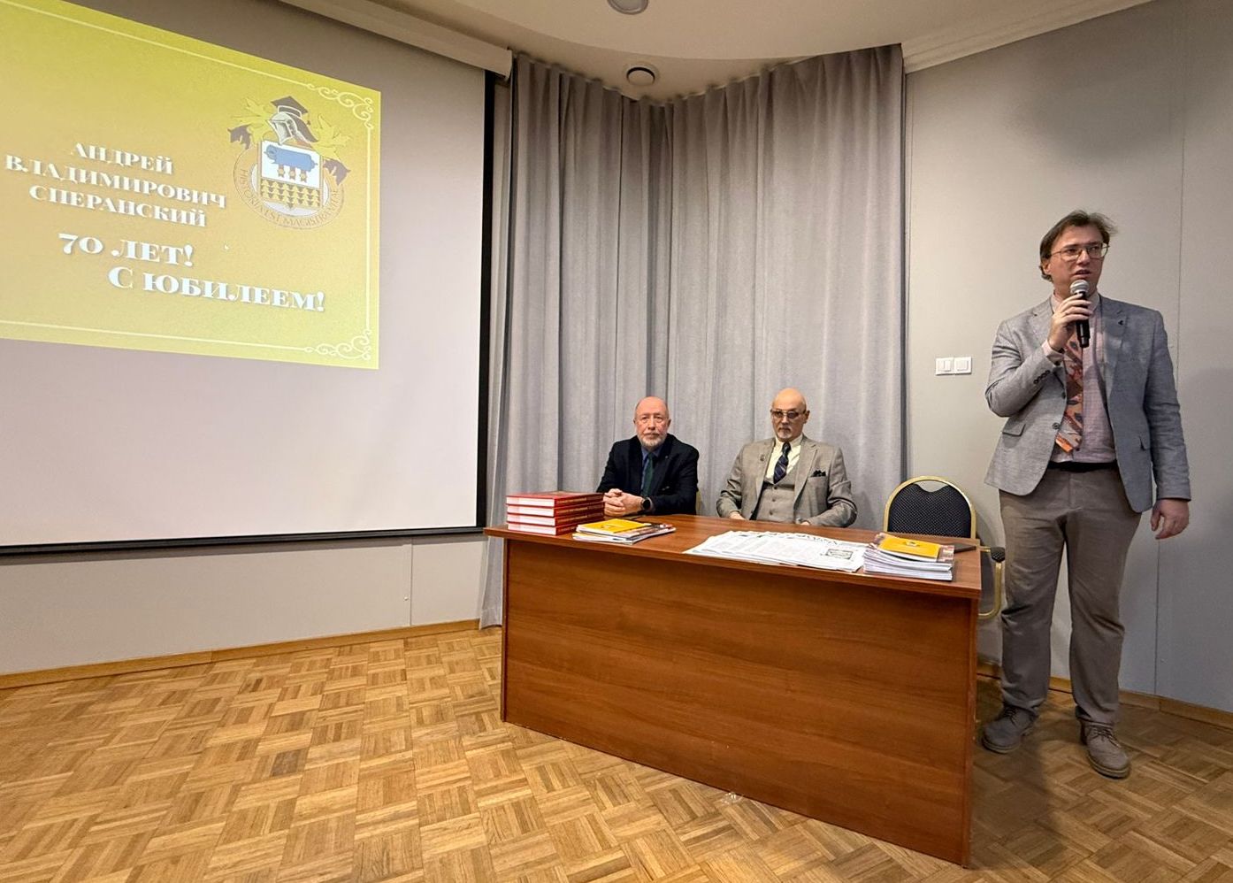 17 октября 2025 г. в конференц-зале гостиницы «Октябрьская» прошел торжественный вечер, посвященный 70-летию доктора исторических наук, профессора, заслуженного деятеля науки Российской Федерации Андрея Владимировича Сперанского – руководителя центра политической истории Института истории и археологии УрО РАН. В ходе мероприятия, после доклада директора Института истории и археологии УрО РАН, члена-корреспондента РАН И.В. Побережникова о творческом пути юбиляра, ученого тепло поздравили вице-президент РАН, председатель УрО РАН, академик В.Н. Руденко, президент Уральского федерального университета В.А. Кокшаров, глава муниципального округа Заречный Свердловской области А.В. Захарцев, заместитель председателя Совета ветеранов Управления ФСБ по Свердловской области М.А. Домнин, генеральный директор Свердловского областного краеведческого музея им. О.Е. Клера В.В. Емельянов, генеральный директор Уральского военно-исторического музея А.В. Сергеев, директор муниципального музея памяти воинов-интернационалистов «Шурави» Н.Л. Просянкина, председатель Свердловской областной общественной организации «Ассоциация ветеранов подразделения антитеррора Альфа-Урал», кавалер двух орденов Мужества В.С. Просянкин и другие деятели науки, культуры и высшего образования.